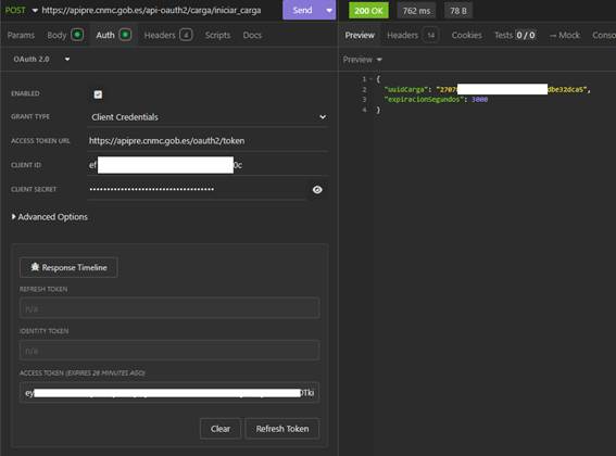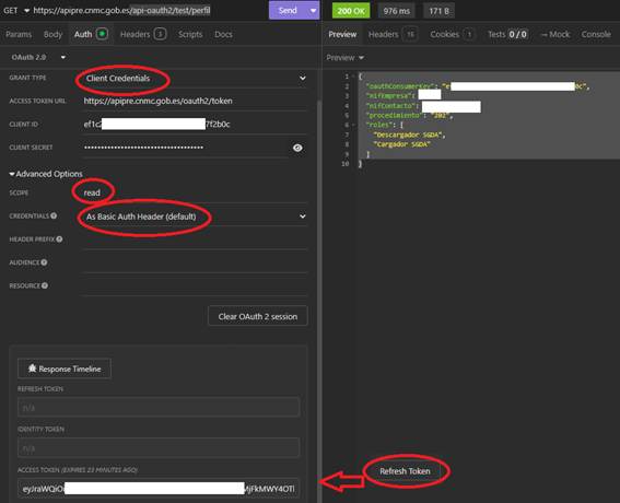 Hay que configurar la parte de Auth con los parámetros indicados de client id y client secret, además de lo marcado en rojo. Pulsar el botón Refresh Token para que actualice el ACCESS TOKEN y a continuación se podrá llamar a los servicios (Botón SEND).