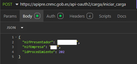 { "oauthConsumerKey": "CONSUMER KEY PROPORCIONADA", "nifEmpresa": "NIF DE LA EMPRESA ASOCIADA", "nifContacto": "NIF DEL CONTACTO/PRESENTADOR DE LAS CARGAS", "procedimiento": "ID DEL PROCEDIMIENTO: SGDA_2025 = 202",Lista de roles que permiten cargar o descargar los ficheros: "roles": [ "Descargador SGDA", "Cargador SGDA" ]}